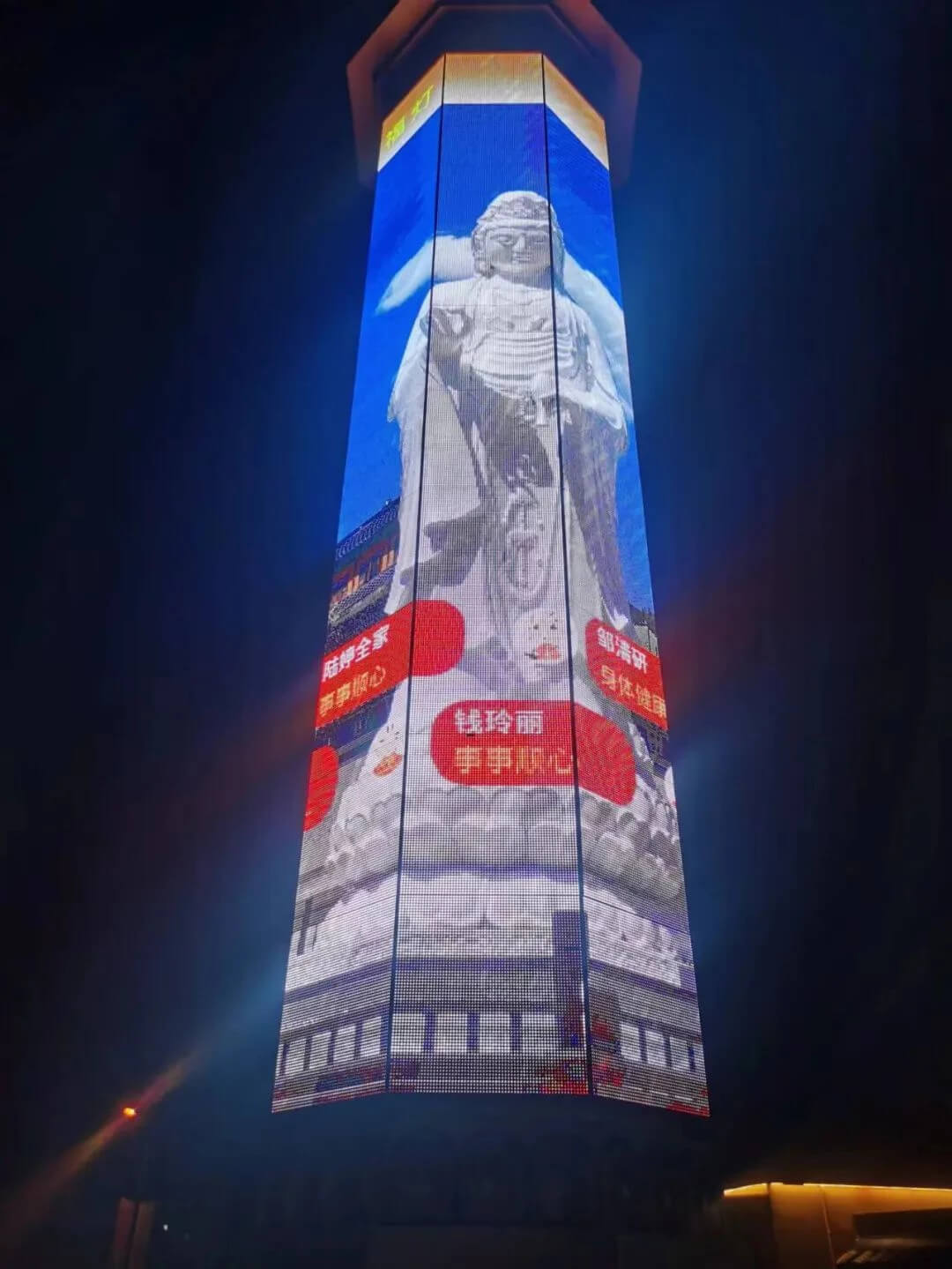 領(lǐng)導(dǎo)、印瑞法師、證道法師為觀音祈福燈揭幕。光明燈,運(yùn)用聲光電打造,日夜不同輪奐之美,佛光普照如臨意境,運(yùn)用超大曲面屏,結(jié)合佛學(xué)故事,佛教/佛陀起源等動(dòng)畫音/視頻,打造極樂(lè)之境。一點(diǎn)一位,成為信眾游客熱門打卡景點(diǎn)。