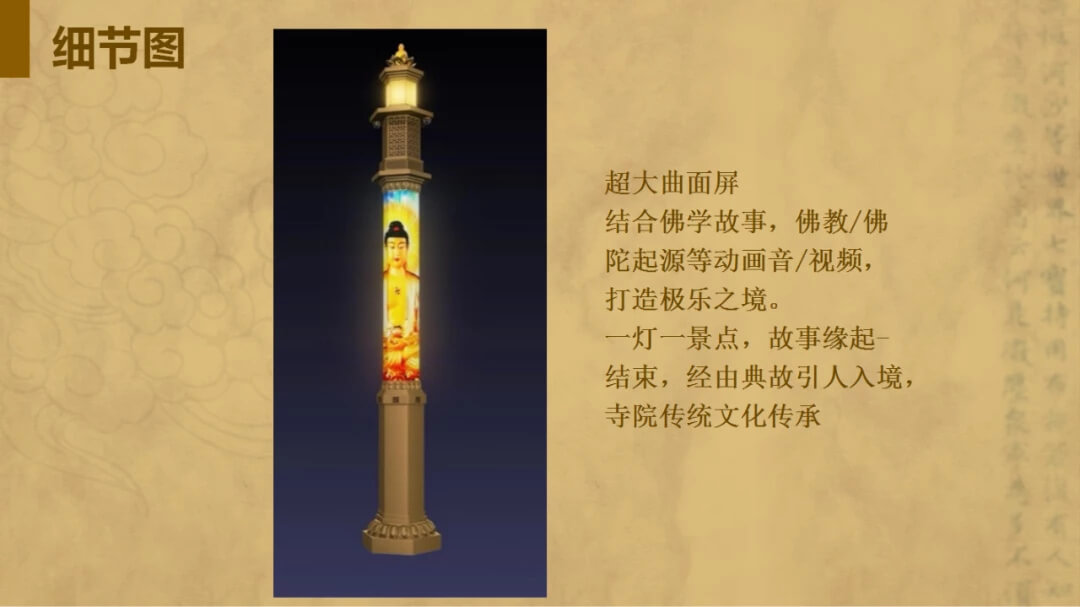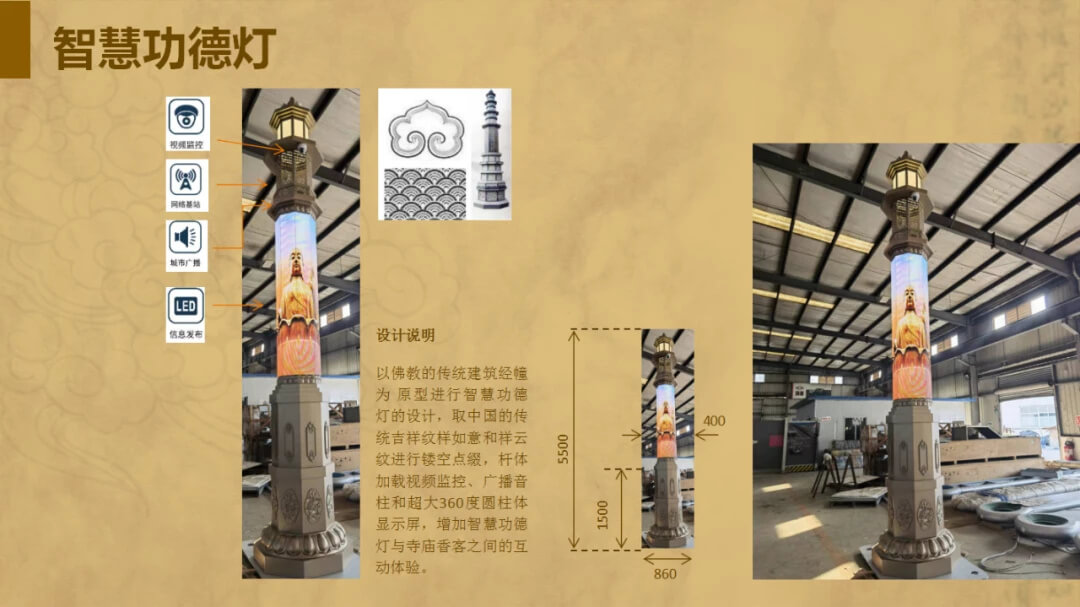 (全國(guó)首支智慧光明燈--通澤寺觀音智慧燈亮相揭幕) 智慧光明燈以佛教的傳統(tǒng)建筑經(jīng)幢為原型進(jìn)行智慧功德燈的設(shè)計(jì),取中國(guó)的傳統(tǒng)吉祥紋樣如意和祥云紋進(jìn)行鏤空點(diǎn)綴,桿體加載視頻監(jiān)控、廣播音柱和超大360度圓柱體顯示屏,增加智慧功德燈與寺廟香客之間的互動(dòng)體驗(yàn)。