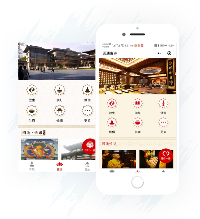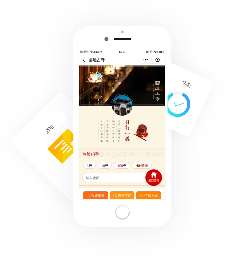 智佛為宗教場所提供了兩款功能豐富的智慧宗教的SaaS系統(tǒng),由基于微信生態(tài)的小程序系統(tǒng)和基于微信公眾號平臺的H5公眾號系統(tǒng)構(gòu)成,內(nèi)含多套模板。